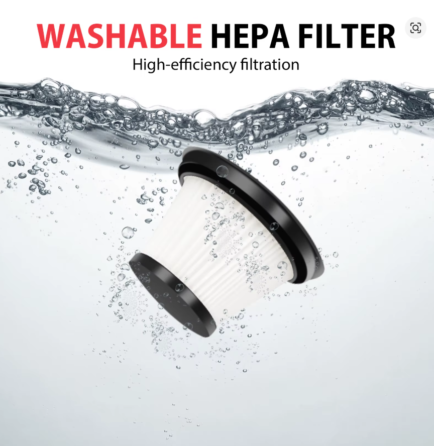3 WASHABLE FILTERS & LONG BATTERY LIFE: The handheld vacuum cleaner comes with 2200mAh Li-Ion battery and a quick charger that can work for up to 30 minutes on a full charge to help you with all-around cleaning, and 3 washable HEPA filters prevent clogging of the filters to ensure perfect suction and save you the cost of buying additional filters.